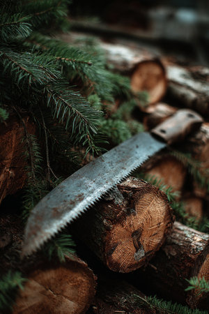 Rusty saw resting on cut logs among fresh pine branches in natural setting