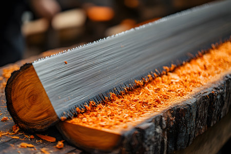 A macro view of a saw in action, cutting across a thick wooden log, generating fine shavings. the image highlights the precision of woodworking tools and the texture of the wood and saw blade. Generative AI