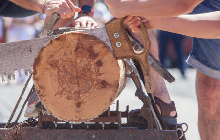 close-up, an old saw is sawing a pine log. work in an outdated way