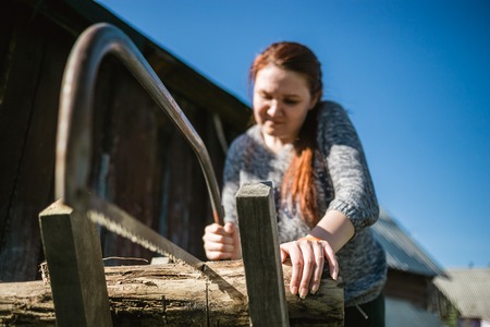 Girl is sawing a wooden beam the hand saw in the garden.