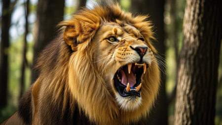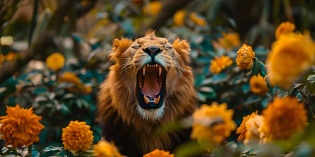 The Roar of a Lion Resonating Amid the Vibrant Colors of the Jungle. Concept Wildlife Photography, Jungle Exploration, Majestic Lions, Vibrant Ecosystem, Nature's Beauty