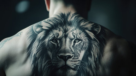 This striking image features a detailed lion tattoo on the back of a male subject, capturing the essence of strength and individuality through intricate black and gray artistry.