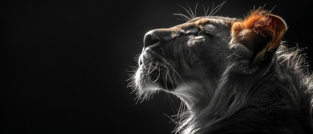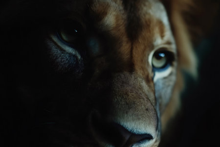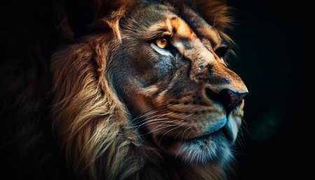 A close-up shot of a lion with a detailed view of its face, fur, and piercing eyes against a dark background, showing the animal's majesty and strength in the animal kingdom, perfectly captured in stunning detail.