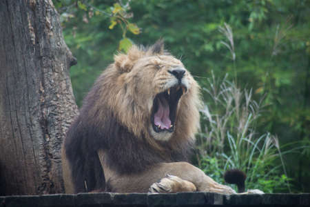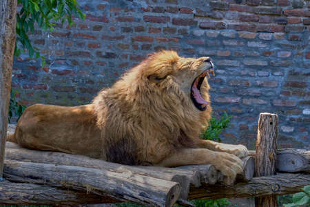 A closuep shot of a lion yawning while sitting on the wooden sticks in the zoo