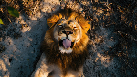 A top view shot of a lion lying in the shade, panting with its tongue out to cool down