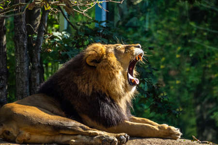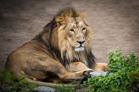 Portrait of male lion lying in a zoologic park