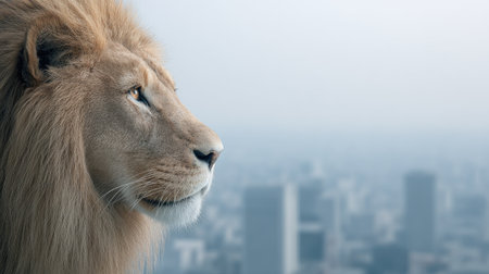 A striking image of a lion wearing a business suit and glasses against a blue urban backdrop symbolizes leadership and strength in a modern world.