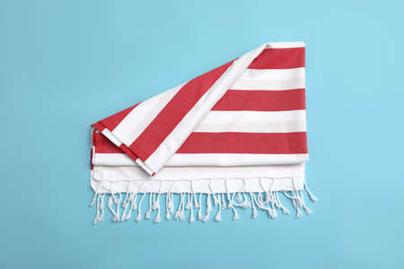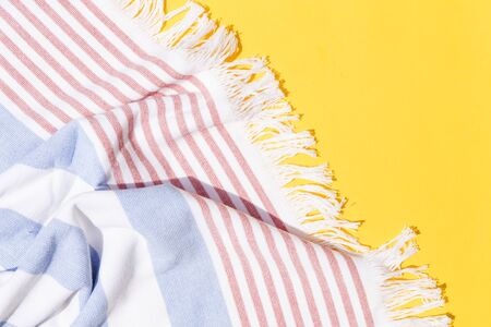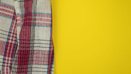 Kitchen towel or napkin over the rustic wooden table. View from above with copy space