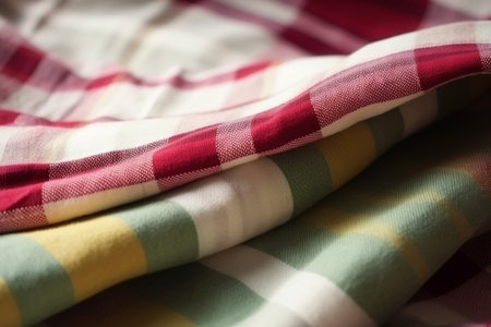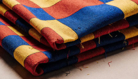 Soft fabric in bright colors of red, blue, and yellow is folded neatly on a flat surface, with a textured pattern creating a lively and artistic appearance.