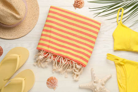 Blue striped swim trunks with sunglasses and towel on blue background.
