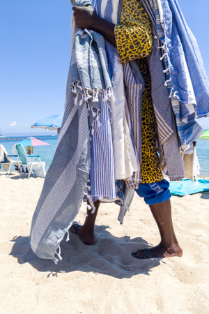 Beach Vendor Draped in Colorful Towels on Sandy Shore