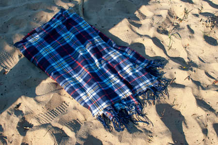 A plaid is lying on a sandy beach. Blue blanket on the sand. relaxing and sunbathing on the beach in autumn or summer.
