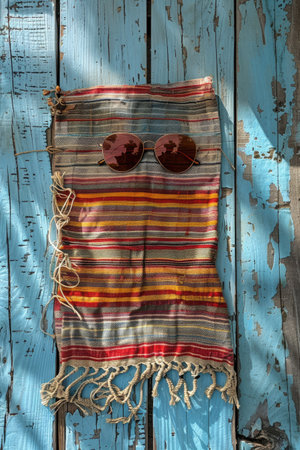 Indulge in the nostalgia of summers past with this minimalistic coastal composition where a retro towel and oldfashioned sunglasses create a captivating scene on grey wood planks