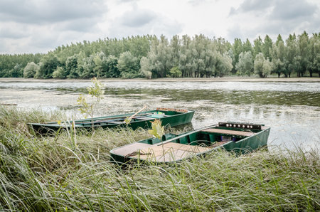 Wooden fishing boats tied to the shore. A view of small wooden fishing boats, moored to the shore of the lake in autumn.