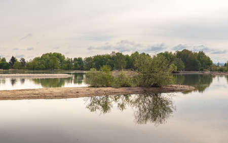 small islands with waterfowl in the pond, Vrbenske rybniky Nature reserve, Ceske Budejovice, Czech republic