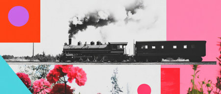 Minimalist collage blends classic steam train with geometric shapes and flowers
