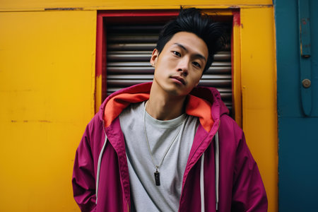 A stylish man stands with a confident look dressed in a pink jacket and white hoodie under a vibrant sunset sky.