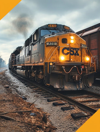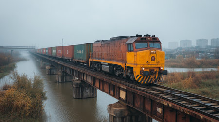 A yellow freight train travels across a bridge above a river with container cars on a misty morning. Generative AI