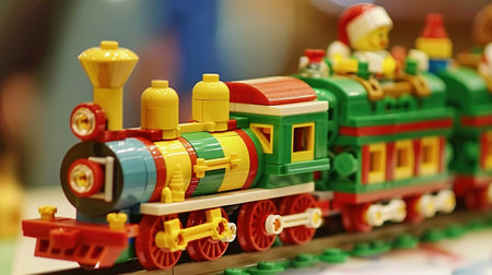 A train set is sitting in front of a Christmas tree. The train is decorated with lights and the tree is adorned with ornaments. The scene is cozy and festive, evoking a sense of warmth
