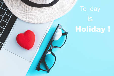 Blue heart icon placed on wooden block text of holiday for campaign and promotion. The concept of off on holiday and planning a holiday