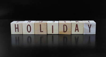 The word HOLIDAY is made of letters formed from wooden blocks, isolated on a black background