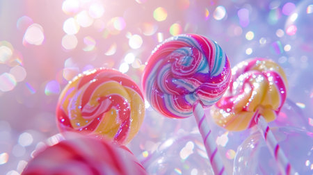Colorful and vibrant lollipops, swirls of candy colors, in a soft focus, dreamy setting, with sparkling bokeh and a light background. The image showcases the details of the candies and their colors and shapes, suggesting a playful and sweet theme suitable for children and a general audience, promoting sweetness and happiness.