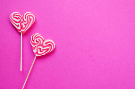 Red sweet tasty lollipop in shape of heart on bright pink background. St. Valentine's day. Copy space