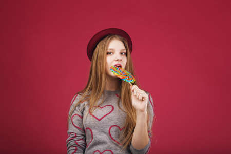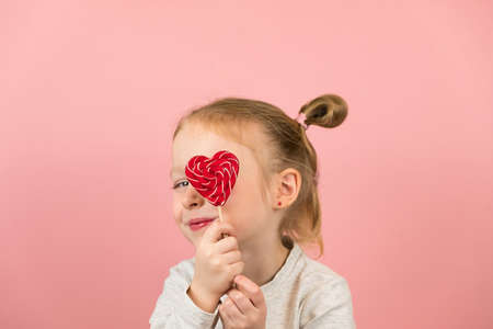 Funny little blonde girl smiling and playing with red heart shape lollipop caramel on pink background. Valentines Day or Mothers Day concept