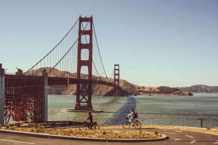 Two people riding bicycles Golden Gate Bridge in San Francisco, United States of America aka USA