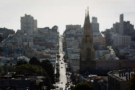 View of Saints Peter and Paul Church and Filbert Street in San Francisco, California.