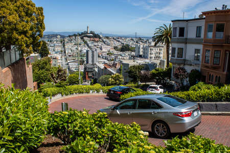 The famous Lombard street on Russian Hill in San Francisco, California, United States of America. A view of the crooked road with curves and turns, the houses the cityscape and coit tower.