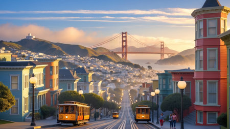 Scenic view of vibrant houses and iconic bridge in San Francisco during golden hour