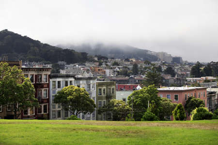 View of San Francisco streets, with Alamo square and city skyline, California, United States, day