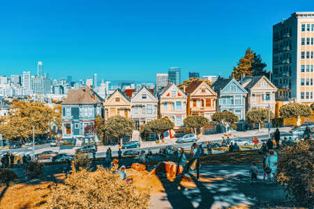 San Francisco, California, USA - September 11, 2018: Panoramic view of the San Francisco Painted ladies (Victorian Houses).