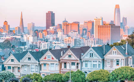 Painted Ladies Victorian houses in Alamo Square and a view of the San Francisco skyline and skyscrapers. Photo processed, in pastel colors