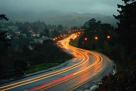 A winding road disappears into the darkness leaving behind a trail of lights that seems to lead straight into the heart of the ocean