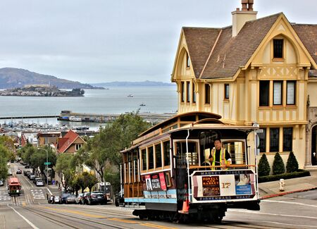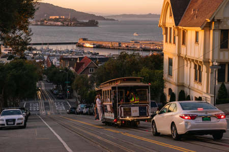 San Francisco, USA - September 30, 2015: Powell Hyde cable car, an iconic tourist attraction, descending a steep hill peak overlooking Alcatraz prison island and the bay.