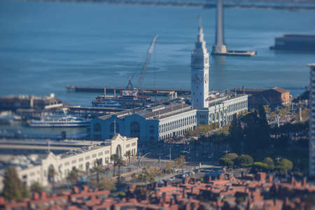 Aerial vibrant view of San Francisco port, with clock tower and the Ferry Building Marketplace, California, United States, seen from Bay Bridge, sunny day