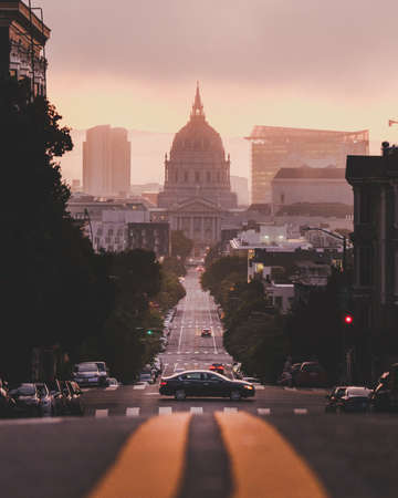 A vertical evening shot of a street sloping upwards in the city of San Francisco, California, United States of America aka USA