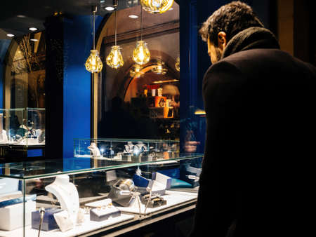 French elegant woman search for the Christmas gift in Jewelry shop from the French Street - searching for the best present during Christmas holidays