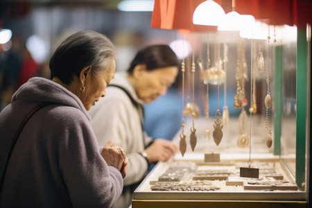 A bustling market scene with traditional jewelry and decorative items on display, featuring vibrant colors, intricate designs, and a variety of cultural artifacts.