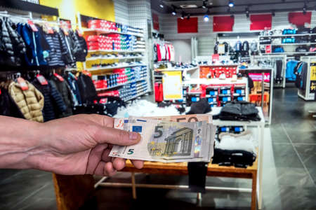 man pays for purchases in a clothing store. shopping