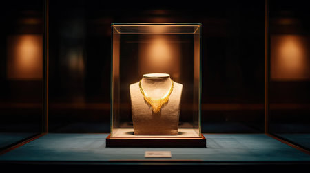This striking image showcases an elegant golden necklace resting in a glass case within a softly lit art gallery, emphasizing luxury and beauty.