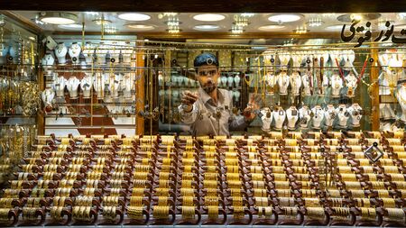 Yazd, Iran - May 2019: Man working inside the window display of gold accessories and jewelry shop in grand bazzar of Yazd