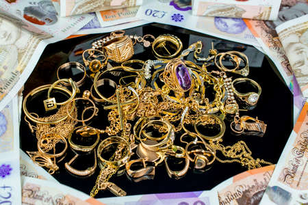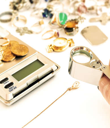 jewelry scrap of gold and silver and money, pawnshop concept jeweler looking at jewelry through magnifying glass, jewerly inspect and verify