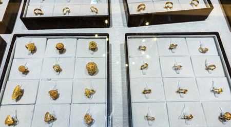 Display of luxury jewelry in a store with soft lighting, emphasizing elegance and sophistication with a focus on gold and diamonds.
