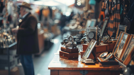 A collection of antique items displayed in a vintage shop, featuring ornate decorations and various collectibles. The rich details and nostalgic atmosphere evoke a sense of history and timelessness.