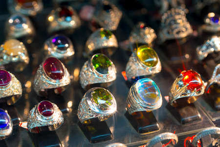 beautiful jewelry made of precious stones on a shelf in a store