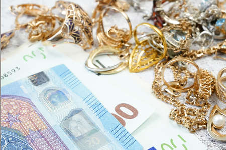 Man buying gold jewellry, pawn shop and euro banknotes