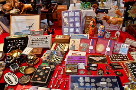 collection of antique and vintage objects for sale, clocks, books compass, Exeter Christmas market Devon UK November 21 2021